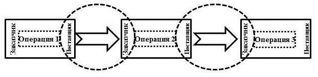 Если обратить внимание на рисунок, то можно увидеть, что в процессе запутанных и сложных взаимоотношений в организации, определённые операции, люди или участки являются одновременно Заказчиками и Поставщиками по отношению друг к другу.