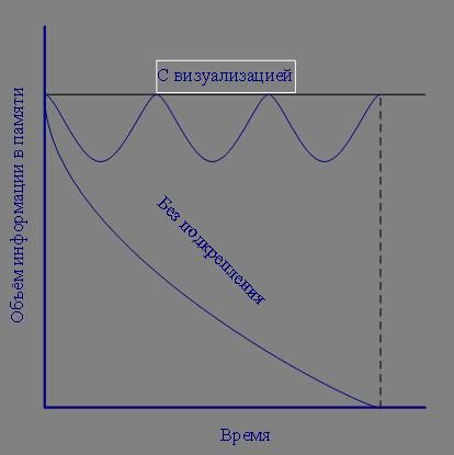 Вторая кривая графика показывает динамику уровня усвоенной работником информации при наличии визуального подкрепления, т.е. когда работник периодически возвращается к нужной информации, либо её основной части и вспоминает её. Вместо визуального подкрепления, таким же образом может срабатывать и постоянно востребованная в работе информация.