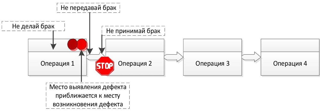 Данный принцип применяется как к деятельности рабочих, так и к функционированию процессов. Полное название принципа, характеризующее его суть: «не принимай брак, не делай брак, не передавай брак». Уже из названия ясно, что данный принцип не является совокупностью применения каких-либо инструментов и приёмов. Он напрямую состоит из парадигм мышления, необходимых для обеспечения качества в организации. В идеальном воплощении этот принцип представляет собой выработанные привычки людей, не производящих, не принимающих и не передающих брак. Однако для практической реализации данного принципа одного лозунга недостаточно. Но обо всём по порядку.
