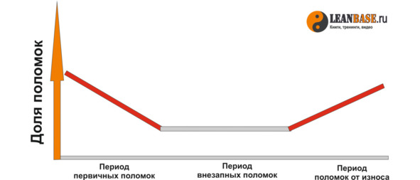 Наблюдается в начале жизненного цикла оборудования, как вы видите на рисунке, поломок в это время относительно много. Далее, количество поломок постепенно снижается, персонал изучает оборудование, приспосабливается к обслуживанию и эксплуатации.