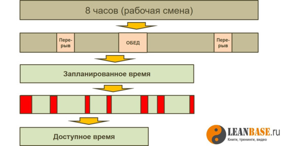 На доступное время влияют поломки и сбои оборудования, потери на наладку, регулировку, технологические потери, документированные мелкие остановки и пусковые потери. Всё, что угодно может уменьшить доступное время.