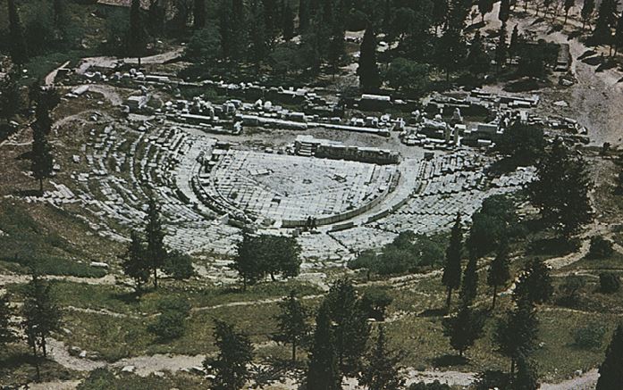 На этой акустически совершенной сцене ежегодно проводится летний фестиваль древнегреческой драмы. На фотографии видны зрительские места, круто уходящие вверх, и прекрасно сохранившаяся круглая орхестра (здания за ней построены специально для постановок и не являются постоянными).