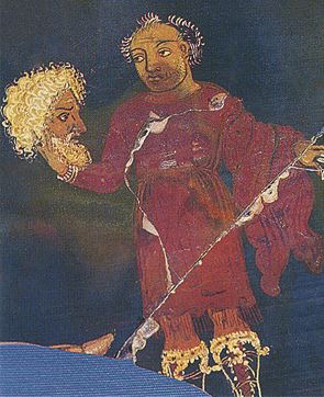 Этот момент из Орестеи Эсхила не разыгрывался на сцене, но изображенные костюмы могут соответствовать тем, которые надевали актеры. Обе роли исполнялись мужчинами.