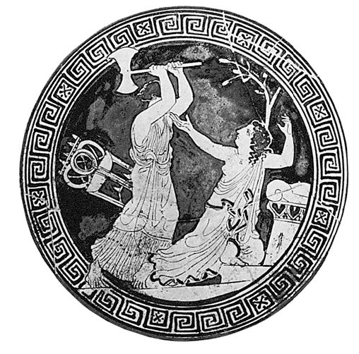 [5] Клитемнестра убивает Кассандру. Краснофигурная роспись килика из Спины. Мастер Марлея. Около 430 года до н. э.