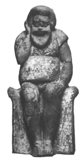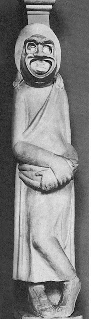 [8] Статуэтка комического актера в маске. Эллинистический период. Траллы, Турция. Скульптура примечательна тем, что показывает лицо исполнителя под маской; скрещенные ноги и сложенные руки – поза, характерная для множества изображений комических актеров.