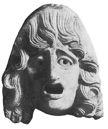 О костюмах исполнителей древнегреческой трагедии мы знаем в основном по изображениям театральных сцен на вазах. Это были одежды искусной работы, яркие и богато расшитые [5, 6], и котурны [3], обувь на высокой платформе, в подражание богу Дионису. Позже под одежду стали подкладывать толщинки, делать котурны еще выше и дополнительно увеличивать рост актеров за счет головных уборов – онкосов [23]. Это усиливало впечатление от сценического присутствия актеров (что было необходимо из-за внушительных размеров открытых театров того времени) и придавало их облику величественность, подобающую трагическим персонажам. Но важнейшим элементом костюма была маска, которую, по преданию, ввел Феспис. Использование масок, вырезанных из светлого дерева или пробки, а иногда скроенных из плотной холстины, позволяло одному актеру исполнять несколько ролей, в том числе и женские, ведь на сцену в Древней Греции допускались только мужчины. Каждая из масок – всего известно около тридцати их разновидностей – не только обозначала возраст, пол и положение героя, но и выражала его основную эмоцию: страх, ярость, ненависть или отчаяние [3, 12, 23]. Актеру, лишенному лицевой мимики и вынужденному из-за костюма довольствоваться широкими, размашистыми жестами, для достижения эффекта приходилось полагаться в первую очередь на силу и выразительность своего голоса. Даже после реформ Еврипида – которого Аристофан в одной из своих комедий критикует за то, что тот одел своего героя «в лохмотья», – актер греческой трагедии оставался статичным и величественным. Он декламировал и пел под аккомпанемент специально написанной музыки (не дошедшей до наших дней), никак не проявляя своей индивидуальности под маской персонажа. Участники хора в трагедии, поскольку им была необходима бóльшая свобода движений, носили легкие маски и костюмы обычных людей.