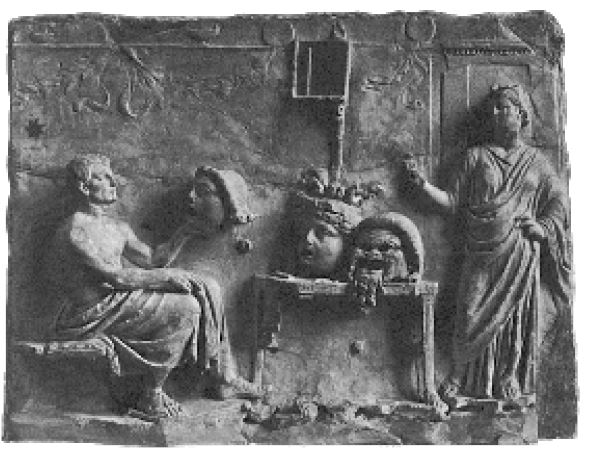 [15] Менандр в мастерской с масками «новой комедии». Римский мраморный горельеф Изображены маски трех главных персонажей комедий Менандра: юноши, гетеры и рассерженного старика. Девушка справа (изначально в правой руке она, по всей видимости, тоже держала маску) – либо муза комедии, либо Гликера, возлюбленная Менандра.