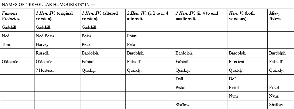 According to my hypothesis, the original names Oldcastle, Ned Poins, Gadshill, &c., were chiefly taken from The Famous Victories of Henry V.; all these disappear from the series by ii. 4 of 2 Henry IV.: the later names, Bardolph, Falstaff, Nym, Pistol, Shallow, persist to the end of the series, but did not occur in the original forms of 1 and 2 Henry IV. The name Falstaff was no doubt taken from 1 Henry VI., in which Shakespeare had been writing on March 1592, and which we know from the Epilogue to Henry V. to have been revived by 1598 at latest.