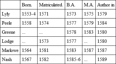 Before considering Group E., iv. 2-7, which is concerned only with Talbot's last fight near Bourdeaux in 1452, I would draw attention to the fact that it is clear that this episode did not form part of the original play: it is merely connected with it by the two lines, v. 2. 16, 17, which may have been inserted for that purpose; belongs chronologically to the next play, and is so different from, as well as so superior to, its surroundings, that in 1876 I suggested that Shakespeare might have written it. Mr. Swinburne has since sanctioned this opinion by adopting it. This, however, is not evidence; what follows is. The scenes in the Folio are not divided in Acts i., ii.; in the other Acts they are. Acts iii. and iv. 1 coincide with the modern division; but v. 1 of the modern editors is iv. 2 in the Folio; v. 2. 3. 4, are iv. 3 in the Folio, and v. 5 in the Folio is the whole fifth Act. Here then is the play completed without iv. 2-7, which are not numbered at all. It is plain that they were written subsequently to the rest of the play and inserted at a revival. They had to be inserted in such a manner as not to break the connection between this play and 2 Henry VI., and were put in the most convenient place, regardless of historic sequence. I take it for granted that this play in its original shape was acted before 2 Henry VI., the commencement of which was evidently meant to fit on to the end of the preceding play. It is in accordance with the hypothesis here announced (that the play acted 3d March 1592 was new only in these Talbot scenes,) that we find Nash in his Piers Penniless (S. R. 8th August 1592) referring only to the Talbot scenes as new. "How it would have joyed brave Talbot, the terror of the French, to think that after he had lain two hundred year in his tomb, he should triumph again on the stage, and have his bones embalmed with the tears of ten thousand spectators at least." It was acted thirteen times at the Rose between March 3 and June 22, that is, at least once a week; was the most popular play of the season, and was probably still in action "about the city" or in the country during the time that the theatres were closed for the plague, from 22d June 1592 till January 1593, when it was again played at the Rose. It was, therefore, in action when Greene's celebrated address "to those gentlemen, his quondam acquaintance, that spend their wits in making plays," was written. This address was published in Greene's Groatsworth of Wit after 2d September, when Greene died, and before 8th December, when Chettle's Kind-Hart's Dream was entered on S. R., and was probably written about June. It is addressed to Marlowe, Lodge, and Peele. Attempts have been made to show that Nash, not Lodge, was the second playwright of this trio, on the ground that Lodge was too old to be called "young Juvenal" or "sweet boy;" was absent from England; was not a satirist, and had foresworn writing for the theatre. The only important argument is that of Lodge's age. As this is important in other respects, I give here a table of the known birth dates, matriculations, B.A. and M.A. degrees, and first appearances as authors of the University men connected at that time with the stage: —