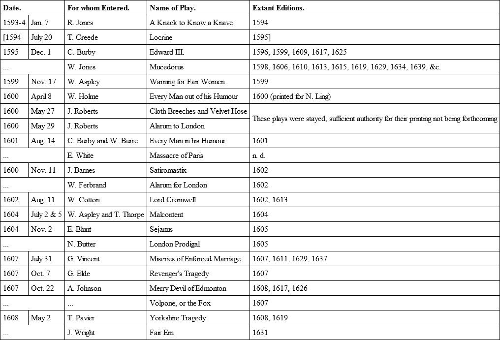 In Table IV. every entry of a play that I can find in the Stationers' Registers is extracted with all necessary fulness. The only point requiring explanation is that the capital letters after the publishers' names indicate the names of the licensers: – T.=Tylney; B.=Sir G. Buck; S.=Segar, his deputy; A.=Sir John Astley; H.=Sir Henry Herbert; T.=Thomas Herbert, his deputy; Bl.=Blagrave, also his deputy. Where the Master of the Revels or his deputy was not the licenser, the insertion of the Wardens' names, &c., would have needlessly encumbered the tables. The spelling has been modernised, except in proper names, &c., where it is of advantage to retain the old forms. These tables afford for the first time complete means of estimating Shakespeare's influence, in I. on the reading public positively; in II. as compared with his co-workers; in III. at Court; in IV. as compared with writers for other companies.