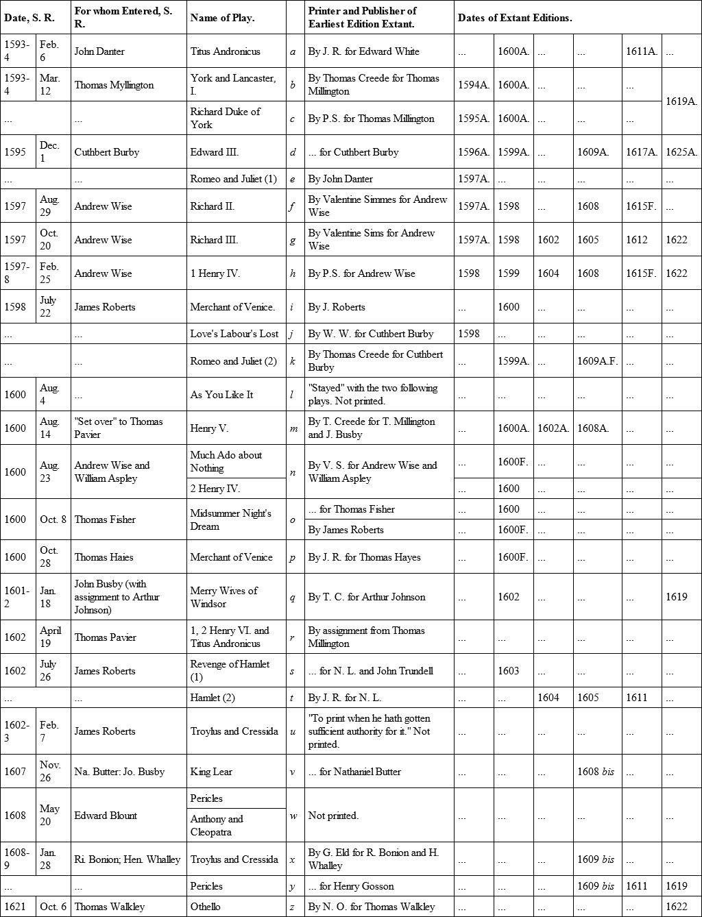 In Table I. I give the dates of the Stationers' Registers entries of Shakespeare's plays as collected in 1623, the printers and publishers of the earliest extant edition of each, and the dates of all known subsequent editions anterior to the 1623 Folio. A. appended to a date means Anonymous, i. e. published without the author's name; F. means that the edition was used by the Folio editors as copy to print from. The relative popularity of the plays will be in some measure seen by a glance at this table. The most popular were Richard III. (six editions in sixteen years); I Henry IV. (six editions); Edward III. (five editions in twenty years); Richard II. (four editions in nineteen years); Henry V. (three editions in nine years). All these were Histories. Next to the Histories rank the Tragedies Hamlet, Romeo and Juliet, and Pericles: the other great tragedies, Lear, Othello, and the Comedies being decidedly less to the popular taste than the Histories. The entries of change of copyright will be found in their places in Table V.