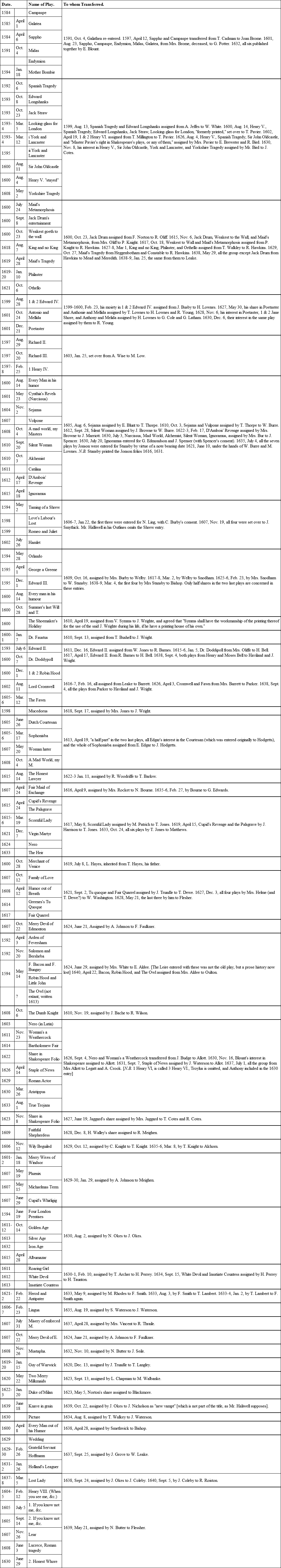 Table V. – TRANSFERS OF COPYRIGHT IN PLAYS, 1584-1640.