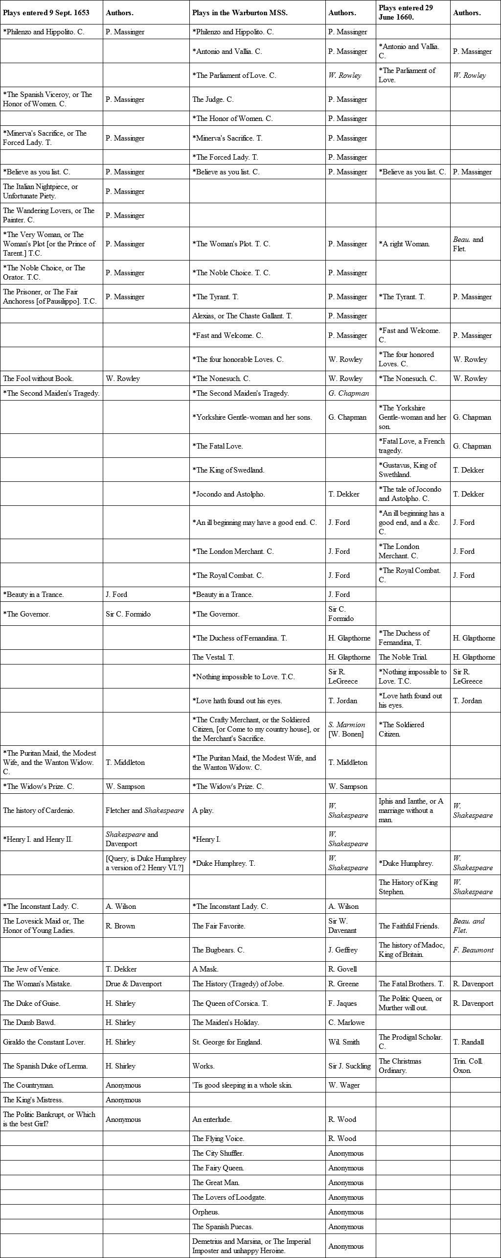 At this point we lose the aid of Mr. Arber's reprint of "The Stationers' Registers," which does not extend beyond 1640. It is, however, necessary to continue our notes to 1660, the date of the reopening of the theatres, because even at that date entries were made attributing plays to Shakespeare. The following memoranda have no pretence to completeness, and are compiled (pending an opportunity of examining the registers themselves) from the much-abused Biographia Dramatica, which is, nevertheless, much more useful than the abbreviated compilation made from it (retaining nearly all its errors) by the scissors of Mr. Halliwell, and published by him as A Dictionary of Old English Plays. Two of these entries are so important for dramatic history that they are printed in parallel columns, with the list of MSS. once in the possession of John Warburton, the Somerset Herald, but mostly destroyed by his cook. From these it will be seen at a glance that three-fifths of his collection consisted of the remainder of Moseley's stock, which contained the majority of old unprinted MSS. extant in 1660.
