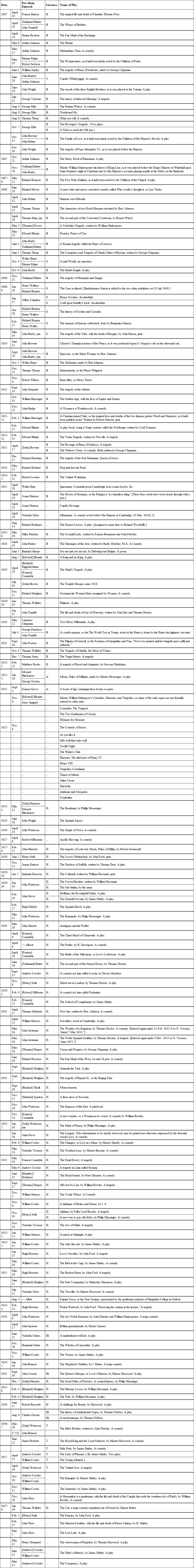 Column ii. The Admiral's men were abroad from 1591 to 1594; in 1603 they were assigned to Prince Henry, and after his death in 1612 to the Palsgrave. The Earl of Hertford's men, who appear once in this column, were not a regular London company, but probably invited to play this once at Court while the Admiral's were abroad, in consequence of the Queen having been entertained by Hertford in the preceding year's progress.