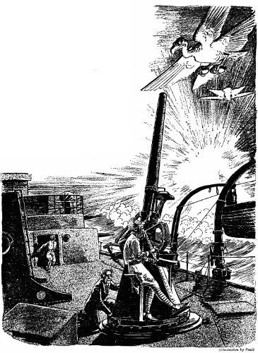 Но птицы, по-видимому, не осознавая, какой тяжелый удар они нанесли, казалось, опасались оружия. Четверо, ползающих на палубе, услышали крик и ответный крик над ними, когда монстры обсуждали вопрос в воздухе. Если они и приняли решение, то было слишком поздно, потому что Макалистер и О'Хара, слепые, шатающиеся и ослабевшие, какими бы они ни были, пошатываясь, добрались до орудия и с грохотом выстрелили в сторону птиц в небесах. Бивилл, оказавшийся ближе к ослепительной вспышке света, приходил в себя медленнее, но все же добрался до мостика, где неуклюже перевел телеграфный сигнал машинного отделения на "Полный вперед".