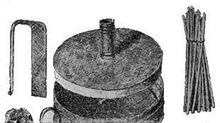 FIG. 6. – TINDER BOX, FLINT, STEEL, AND SULPHUR-TIPPED SPLINTERS.