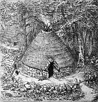 The most important uses of fire were taught by fire itself. As the primitive man stood near the flames of the burning tree and felt their pleasant glow, he learned that fire may add to bodily comfort; and when the flames swept through a forest and overtook a deer and baked it, he learned that fire might be used to improve the quality of his food. The hint was not lost. He took a burning torch to his cave or hut and kindled a fire on his floor of earth. His dwelling filled with smoke, but he could endure the discomfort for the sake of the fire's warmth, and for the sake of the toothsomeness of the cooked meats. After a time a hole was made in the roof of the hut, and through this hole the smoke passed out. Here was the first stove. The primitive stove was the entire house; the floor was the fireplace and the hole in the roof was the chimney (Fig. 1). The word "stove" originally meant "a heated room." So that if we should say that at first people lived in their stoves, we should say that which is literally true.