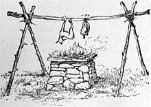 Early inventions in cooking consisted in simple devices for applying flame directly to the thing which was to be cooked. The first roasting was doubtless done by fastening the flesh to a pole placed in a horizontal position above the fire and supported as is shown in Figure 2.5 The horizontal bar called a spit was originally of wood, but after man had learned to work in metals an iron bar was used. When one side of the flesh was roasted the spit was turned and the other side was exposed to the flames. The spit of the primitive age was the parent of the modern grill and broiler.