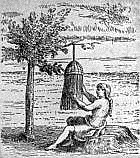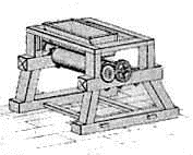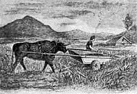 So about the year 1800 inventors in Europe and in America took up the task of inventing a new kind of reaper. The first attempts were made in England where population was increasing very fast and where large quantities of grain were needed to feed the people. The first hints for a reaper were from a machine which was used in Gaul nearly 2,000 years ago. Pliny, who described for us a wonderful plow used in his time (p. 77), also describes this ancient reaper of the Gauls. It consisted of a large hollow frame mounted on two wheels (Fig. 7). At the front of the frame there was a set of teeth which caught the heads of grain and tore them off. The heads were raked into the box by an attendant. The machine was pushed along by an ox. This kind of machine was doubtless used in Europe for a while but it was not a success. It passed out of use and for many centuries it was entirely forgotten. Still, the first English reaping machines were made after the plan of this interesting old reaper of ancient Gaul.