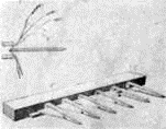 In the loom worked by the Pueblo woman (Fig. 5) a new piece appears. This is the frame through which the threads of the warp pass and which the woman is holding in her right hand. The frame is called a heald, or heddle (Fig. 6). The heddle is of the greatest importance in the construction of the loom and it is well worth while to understand what it does. In the loom operated by the Chilcoot woman (Fig. 4) you noticed that the weaver passed the weft thread above and below the alternate threads of the warp. This required a separate movement for every thread of the warp; if there were a hundred threads a hundred movements were required to pass the weft across once. Now the heddle used by the Pueblo woman separated the fifty warp threads that were to pass above the weft thread from the fifty that were to pass below it, making an opening called, a shed. When the shed was made the weft thread could be passed across at one movement. One movement instead of a hundred! How was this accomplished? Fifty alternate warp threads were passed through the holes in the bars of the heddle frame, one thread through each hole; the other fifty alternate threads passed between the bars of the heddle frame. Now suppose the entire warp of a hundred threads is stretched tight and firm between the woman's body and the yarn beam. With her right hand she raises the heddle and thus lifts the fifty threads which pass through the holes in the bars, while the other fifty threads remain unmoved. This movement makes the passage or shed through which she passes the weft with the left hand. After beating the weft thread close to the cloth either with the fingers or with a sword-like stick, she lowers the heddle with its fifty threads, the other fifty still remain fixed and unmoved. Another shed is formed and the weft is passed through again. Thus with the raising and lowering of the heddle the weft is passed backward and forward and the weaving goes on quite rapidly. If you care to do so you can make a Pueblo loom and can weave a belt on it.