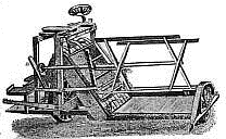 The most remarkable of the early reapers was one invented by Henry Ogle, a schoolmaster of Remington, England. In 1822 Ogle constructed a model for a reaper which was quite different from any that had appeared before and which bore a close resemblance to the improved reapers of a later date. In Ogle's reaper (Fig. 8) the horse walked ahead beside the standing grain, just as it does now, and the cutting apparatus was at the right, just as it is now. The cutter consisted of a frame at the front of which was a bar of iron armed with a row of teeth projecting forward. Directly under the teeth lay a long straight edged knife which was moved to and fro by means of a crank and which cut the grain as it came between the teeth. A reel pushed the grain toward the knife and there was a platform upon which the grain when cut might fall. Ogle's machine did not meet with much success yet it holds a very high place in the history of reaping machines, for it had nearly all the parts of a modern reaper.
