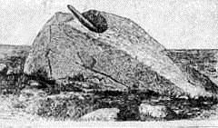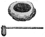The mill which consisted of a hole in a rock and a stone in the hands was followed by the "knocking-stane" and mallet (Fig. 2). The "knocking-stane" was a mortar, or cup-shaped vessel made of stone; the mallet was usually made of wood. The grain was placed in the mortar and struck repeatedly with the mallet, the beating being kept up until a coarse flour was produced. This is an exceedingly rude method of crushing grain, yet this is the way the people in some parts of Scotland grind their barley at the present time.