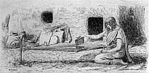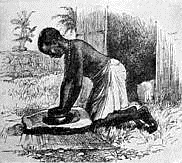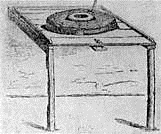 The mortar and pestle were followed by the slab-mill (Fig. 4). Here the grain was ground by being rubbed between two stones. Dr. Livingstone, the great African explorer, gives the following description of a slab-mill which he saw in operation in South Africa. "The operator kneeling grasps the upper millstone with both hands and works it backwards and forwards in the hollow of the lower millstone, in the same way that a baker works his dough. The weight of the person is brought to bear on the movable stone and while it is pressed and pushed forward and backward one hand supplies every now and then a little grain to be bruised and ground."