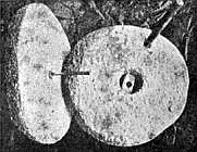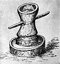 At a very early date the "knocking-stane" was laid aside for the mortar and pestle (Fig. 3) almost everywhere. In this mill the grain instead of being struck with a hammer was pounded with a pestle. The bottom of the pestle was frequently covered with iron in which grooves were cut. As the man pounded he found that when he gave the pestle a twirling or rotary motion as it fell it ground the grain much faster. We may be sure that after this was learned the twirling motion was always given.