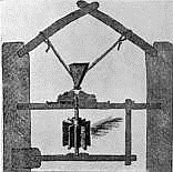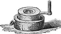 As we have seen, the primitive miller gradually learned that the pestle did better work when it fell with a twirling motion. This little bit of experience led to important results in the development of the mill. If the grinding were done better with a twirling motion, why not have as much of the twirling motion as possible? Why not make the upper stone go round and round? This was what was done. The upper stone was caused to turn round and round. The wheel-mill, the mill of the upper and nether millstone (Fig. 5), was invented. When and where it was invented we cannot tell for it was in use among all civilized peoples before history began to be written. There were many kinds of wheel-mills among the nations of antiquity and in principle they were all alike in construction. How they worked may be learned by studying Figure 5 which represents a mill used in ancient India. The upper stone is placed upon the pivot projecting from the center of the lower (nether) stone, and caused to revolve by means of the handle. The grain when placed in the hollow at the center of the upper stone (Fig. 5) works its way down between the stones and comes out at the circumference ground, bran and flour together. The mill was fed with grain by the operator. The first hopper was a human hand.