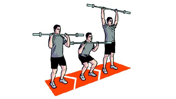 Otro ejercicio útil es una combinación entre press lento por delante con barra, sentadilla frontal y empuje, el Front Squat Push Press.