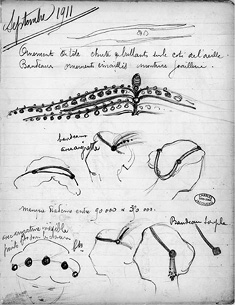 Как мотыльки на огонь, Луи и Жако снова и снова возвращались на спектакли «Русских балетов» – с альбомами и карандашами, в поисках новых идей. Бакст, известный использованием драматических цветовых комбинаций, описал, как в «Шехеразаде» «против ядовитой зелени я положил синий, полный отчаяния, как это ни парадоксально». Вскоре Жако отразил это в своих набросках. Он писал в своем дневнике, как его радовала возможность создавать драгоценности: «Мсье Луи, нанявший меня для создания драгоценных предметов искусства, теперь думает, что я мог бы отличиться и в создании ювелирных украшений; он попросил меня сделать несколько эскизов. Это намного интереснее, чем работа с восьмеркой других дизайнеров». Для Жако было смелым шагом порвать с модой на монохромные украшения, но его решение разместить синий и зеленый рядом друг с другом в украшениях – как это делал Бакст в своих костюмах – сразу привлекли законодателей моды. Среди них был и сам Бакст, который выбрал кольцо с изумрудом и сапфиром.