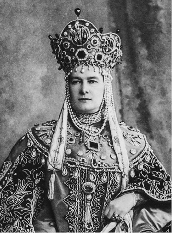 Великая княгиня Мария Павловна, жена великого князя Владимира, в костюме для бала 1903 года в Зимнем дворце Санкт-Петербурга. В ее головном уборе виден знаменитый набор романовских изумрудов
