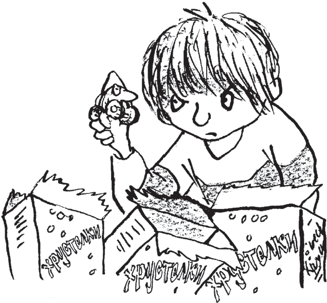 Его нельзя купить. Его можно только случайно найти в коробке с «Хрустелками». А мама не покупает новую упаковку «Хрустелок», пока Генри с Питером не докончат старую. Ради своей коллекции Генри съел уже целую тонну «Хрустелок». И всё это зазря, потому что золотой чудик достался Питеру!