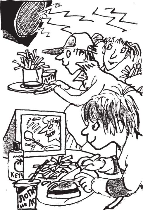 И какая там еда! Высоченные бургеры, огромные пиццы, горы кетчупа. И картошки фри дают сколько хочешь. А ещё пятьдесят два вида мороженого. И никаких овощей!