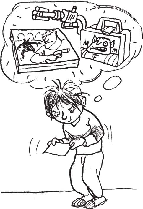 Ужасный Генри потряс маленький тощий свёрток. Что-то подозрительно лёгкий. Даже слишком. Может, в нём деньги? Это было бы просто супер! Ну, конечно, деньги. Что же ещё? Генри уже давно мечтал о контейнере для еды с «Мутантом Максом», бац-бац-шмяк-бластере и особенно о новой игре «Терминаторы-гладиаторы» – рекламу с ней постоянно крутили по телику. Мама с папой такие злые и жадные, они ни за что не купят эту игру. Но на свои собственные денежки Генри может купить всё, что захочет! Вот так! ХА-ХА-ХА. Ральф позеленеет от зависти, увидев у Генри контейнер с «Мутантом Максом». И Генри ни за что не разрешит Питеру даже прикасаться к бац-бац-шмяк-бластеру.