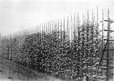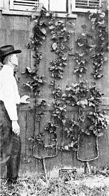 One occasionally sees much more elaborate schemes of training than any here mentioned. There are complex geometrical designs, even pictorial figures—birds, dogs, and beer-steins—and sometimes the initials of the gardener, or the name of his kingly and imperial majesty. In every case the method of producing these forms is practically the same. A frame is built of wood or wire in the form which it is desired to give the tree. Branches are developed at suitable points on the tree and these are tied out while they are growing to the wooden or metal form. It does not require any special care or ingenuity to produce the most elaborate designs in this method. It is essentially a job of carpentry.