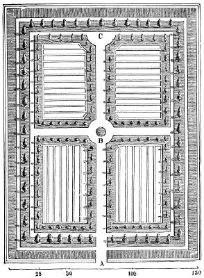 A is the entrance; B, well or cistern; C, space to turn a horse and cart.