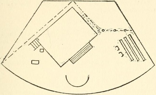 (In the midst of the market place is a simple stage, from which a flight of steps leads to the spectators' seats, as shown in the above plan. A rope separates the auditorium from the rest of the market place. The back of the stage is curtained off. To the left, a small stairway leads from the stage to a space which serves as a dressing room. The King is kneeling in this space, before a little mirror, making up his face to resemble a majestic kingly mask. He is smooth shaven, is in his shirt sleeves and is clad simply, but richly. Princess Alma sits near him, on an upturned box, with her left foot over her right knee, tuning her lute. She wears a tasteful punchinello's dress, all of white, composed of tights, a close-fitting jacket, trimmed with fur, and a high pointed hat.)