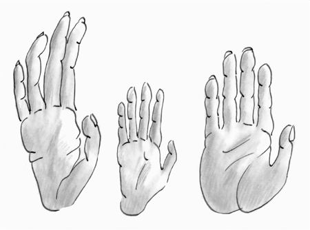 У кисти гиббона большой палец не противопоставлен всем остальным. Такая кисть скорее предназначена для захвата ветвей, а не для подъема предметов с плоской поверхности. Только после того, как морфологию рук гиббонов приняли во внимание, эти человекообразные обезьяны все-таки прошли известные интеллектуальные тесты. На рисунке сравниваются кисти (слева направо) гиббона, макаки и человека. По Benjamin Beck (1967)