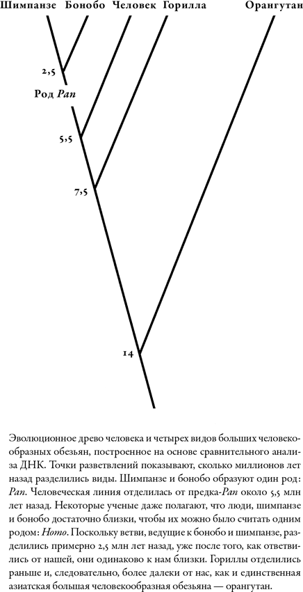 Поскольку гориллы отделились от нашей эволюционной ветви чуть раньше шимпанзе и бонобо, утверждается, что тот вид, который больше похож на горилл, заслуживает названия исходного. Но кто сказал, что сами гориллы похожи на нашего последнего общего предка? У них ведь тоже было предостаточно времени, чтобы измениться, – фактически, больше 7 млн лет. Мы вместо этого ищем человекообразную обезьяну, меньше всего изменившуюся с течением времени. Такаёси Кано, крупнейший эксперт по диким бонобо, заявлял, что, поскольку бонобо никогда не покидали влажных джунглей (в то время как шимпанзе сделали это частично, а наши предки – полностью), они, вероятно, сталкивались с меньшим давлением, побуждающим к изменениям, и потому могут оказаться больше прочих похожими на лесную человекообразную обезьяну, от которой мы все произошли. Американский анатом Гарольд Кулидж высказал известное предположение, что бонобо, «пожалуй, больше приближены к общему предку шимпанзе и человека, чем любой из ныне живущих шимпанзе».