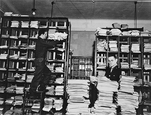 Ил. 12. Комната документов в Нюрнберге с ее шаткими стопками документальных свидетельств. Ноябрь 1945 года. Источник: Американский мемориальный музей Холокоста. Фотограф: Чарльз Александр. Предоставлено Национальной администрацией архивов и записей, Колледж-Парк