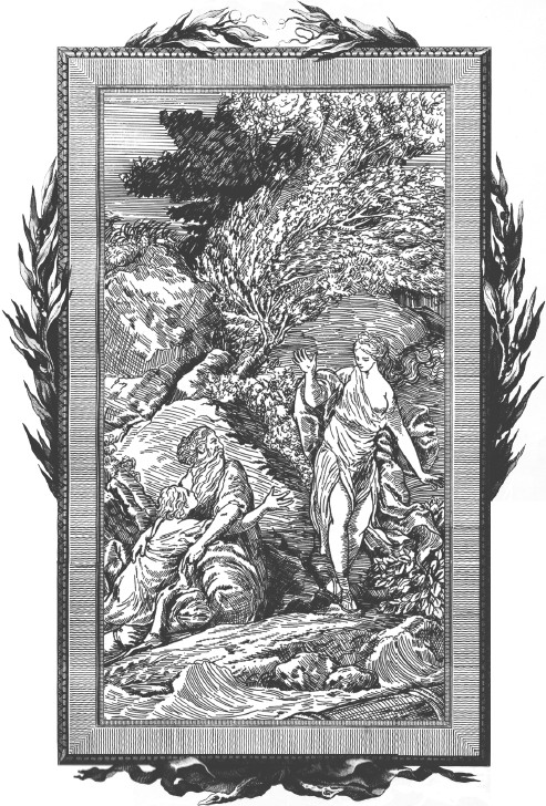 Вдруг она видит обломки разбитого корабля, доски переломленные, весла, выброшенные на берег, руль, мачту и разные снасти, поверх зыбей несомые к острову. Скоро завидела она вдали двух странников: одного в преклонных уже летах, другого при всем еще цвете юности, сходного с Улиссом приятностью и горделивой осанкой, ростом и величавою поступью, предугадала, что то был Телемак, сын мудрого героя. Но, хотя боги знают все и недоступное уму человеческому, она не постигала, кто бы был его спутник, почтенный сединами. Вышние боги блюдут в глубоком мраке от низших богов все, что им благоугодно, и Минерва, сопровождая Телемака во образе Ментора, не хотела вверить своей тайны Калипсо.
