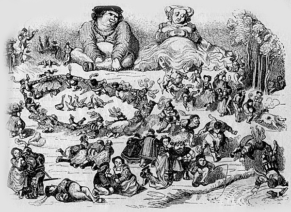 Все-таки он говорил жене, чтобы та ела поменьше, в виду приближения срока, и что эти потроха не очень-то хорошая еда. «Кто ест кишки, – говорил он, – захочет попробовать и того, что в них». Невзирая на эти предостережения, Гаргамель съела этих кишок шестнадцать больших бочек, две малых, да шесть горшков. Зато и раздулись кишки у ней.