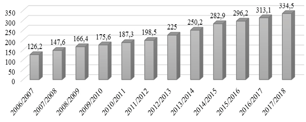 Рис. 1. Численность иностранных студентов в российских университетах, тыс. чел.[36]
