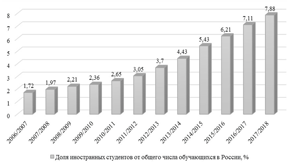 Рис. 2. Доля иностранных студентов от общего числа обучающихся в России, %[37]
