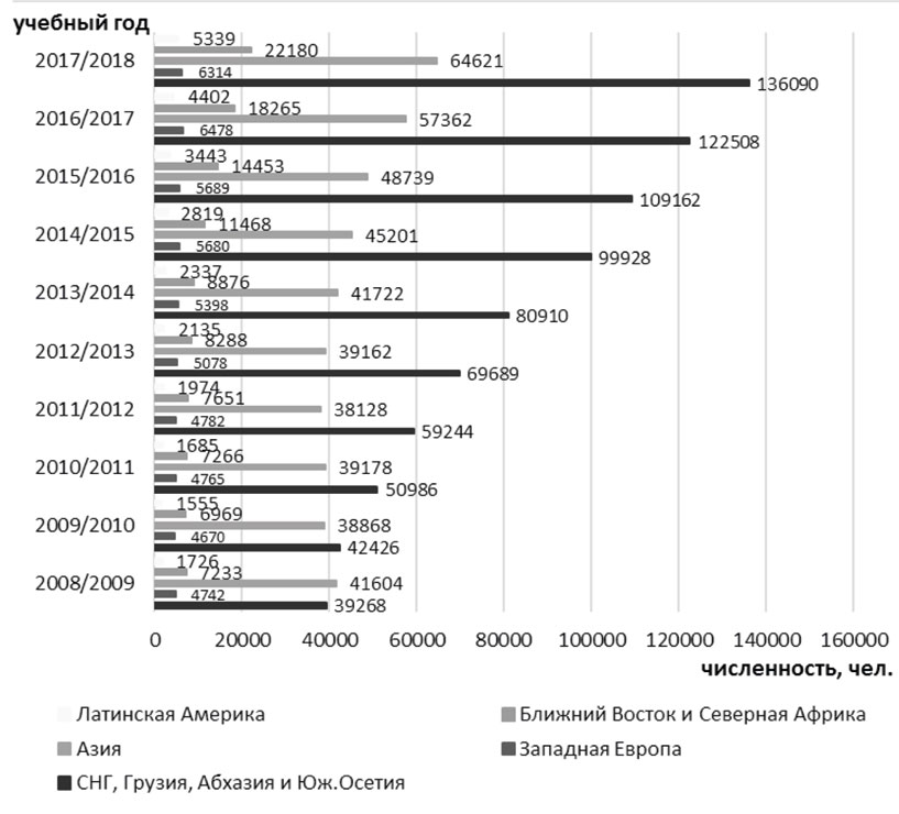 Рис. 3. Численность иностранных студентов по странам происхождения, за исключением стран Северной Америки и Океании, Северной Европы и Африки к югу от Сахары, чел.[38]