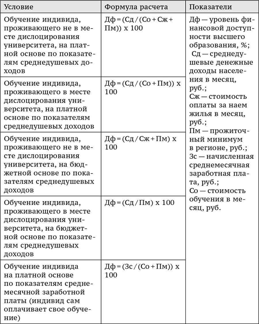 Российскими авторами предлагаются также методики оценки отдельных видов доступности высшего образования. А.Д.Громов, Д.П.Платонова, Д.С.Семенов, Т.Л.Пырова в работе «Доступность высшего образования в регионах России»[71] для оценок финансовой доступности высшего образования используют показатель, учитывающий: