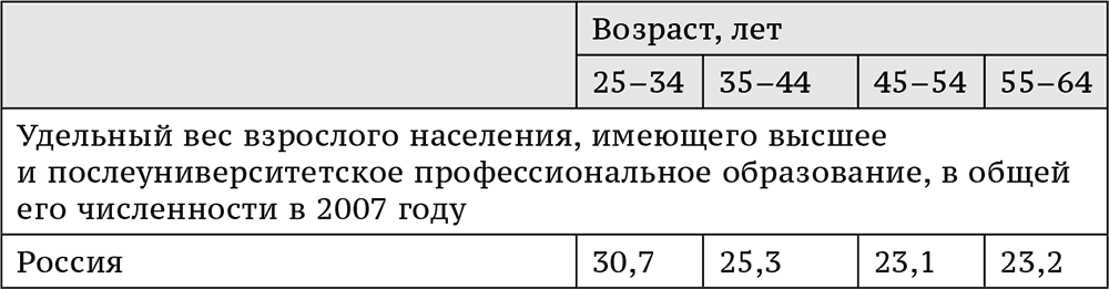 Индекс социального равенства в образовании отражает доступность высшего образования для молодых людей из всех социально-демографических групп. Несомненно, в большинстве стран дети интеллигенции имеют значительно больше шансов получить высшее образование, чем дети рабочих, независимо от стоимости обучения. В России, к сожалению, отсутствуют необходимые статистические данные об образовании мужчин соответствующей возрастной группы, но, по ориентировочной оценке, в России индекс социального равенства ниже, чем в большинстве развитых стран[97].
