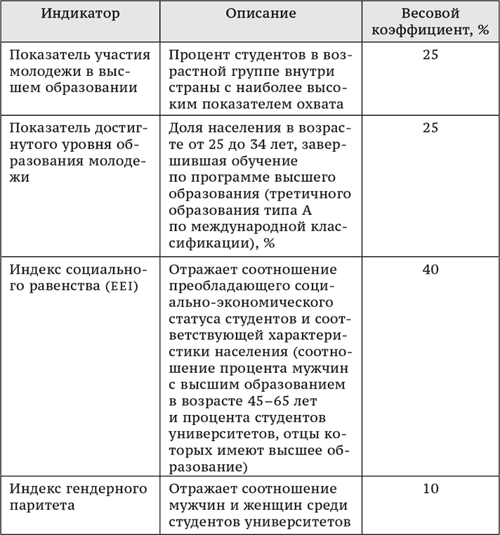 Таблица 4. Индикаторы доступности высшего образования методики канадских исследователей[95]