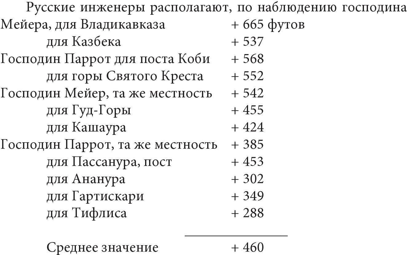 Это постоянное уменьшение в результатах работы господ Энгельгардта и Паррота поразительно и во всем соответствует ошибке в счислении, при котором их оценка Черного и Каспийского морей побудила ученых предположить, что уровень последнего на 329 футов ниже первого. Господин Паррот сам согласился с этой ошибкой, которая, должно быть, произошла на участке выравнивания, имевшем место между Моздоком и Черным морем. Я удивлен лишь тем, что этот ученый не придал большего значения повторной оценке проезда от Моздока до Коби, ошибочно руководствуясь выравниванием 1811 года, которое определенно неправильно, поскольку основа, на чем оно рассчитывалось, неверная.